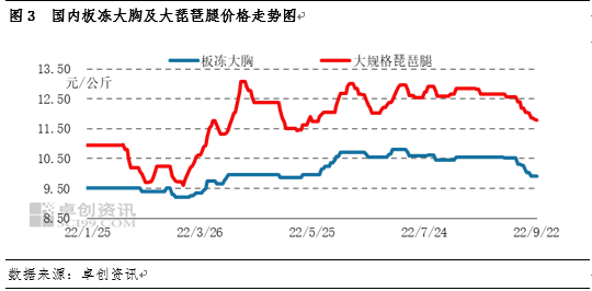 本周白羽肉雞產品價格環比下滑。板凍大胸周度均價9.97元/公斤,環比跌幅4.04%,同比漲幅6.97%;大規格琵琶腿周度均價11.92元/公斤,環比跌幅3.95%,同比漲幅21.88%。周內毛雞價格走低,食品加工企業補貨積極性不佳,雞胸肉市場交投節奏放緩,周內雞胸類產品價格環比下滑。大規格腿類產品供給量充足,廠家多有讓利出貨情況,經銷商按需補貨,產品交投節奏不快,周內肉雞大規格產品價格走低。