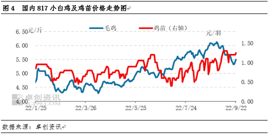 817小白雞:下周毛雞供應增幅有限,臨近國慶市場需求增加,交投向好,雞價或微漲。10月中上旬市場需求逐漸轉淡,疊加毛雞供應仍有增加趨勢,供需雙重利空市場,雞價或回落,卓創資訊預計未來三周817小白雞均價5.54元/斤。